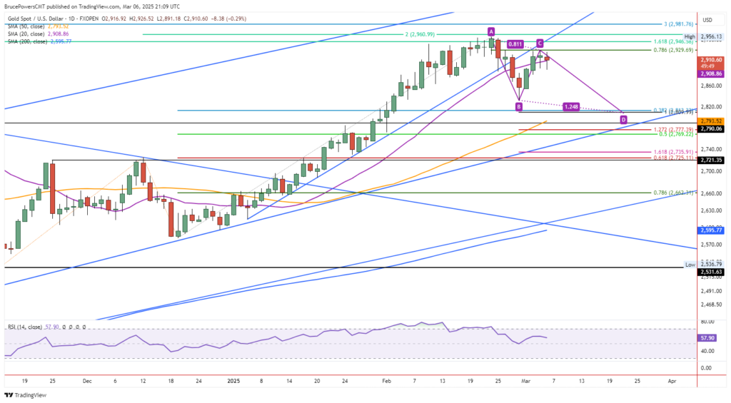 Tác giả: Bruce Powers | Cập nhật ngày 6/3/2025 Diễn biến giá vàng Sau một đợt tăng mạnh, giá vàng đang kiểm tra mức kháng cự quan trọng. Nếu phá vỡ ngưỡng 2.891 USD/ounce, thị trường có thể bước vào giai đoạn điều chỉnh sâu hơn, với vùng hỗ trợ dự kiến từ 2.810 – […]